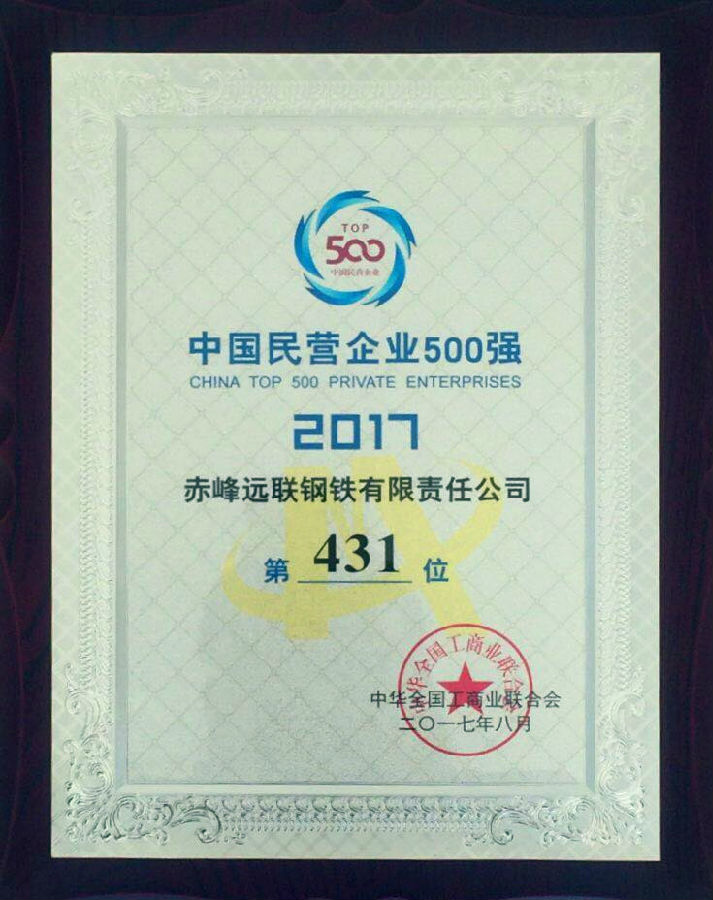 2017年8月,公司被中国工商联评为“中国民营企业500强第431位”